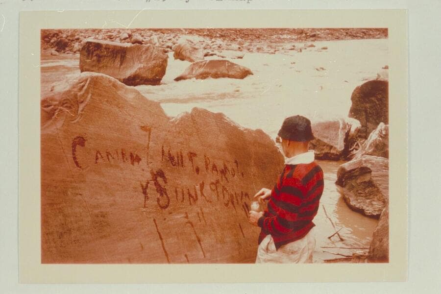 Dock photographs Jorgen Visbak who points up the Best Expedition inscription at Mile 204 1/2. Best Wreck Rapid