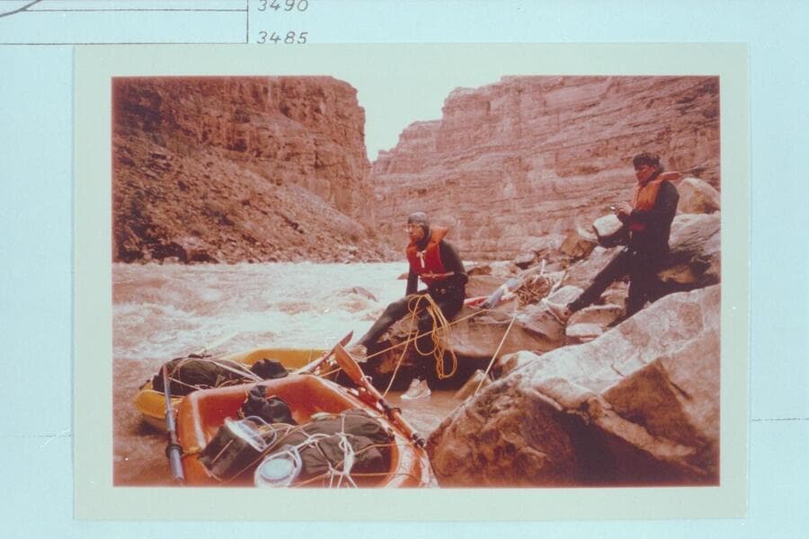 Dock Marston lines a boat at Dark Canyon Rapid. Jorgen Visbak and Buzz Belknap in distance