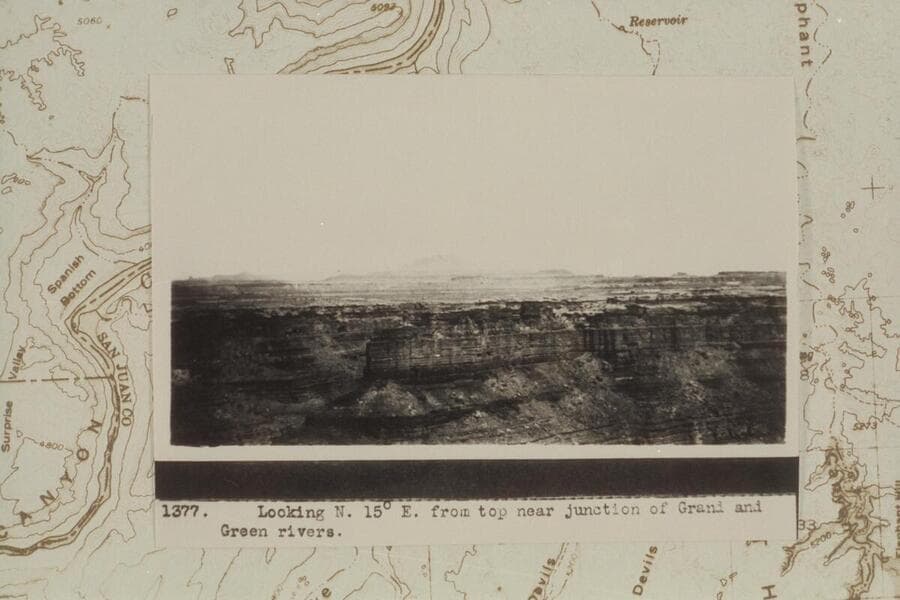 Head of Cataract Canyon, looking down from top of walls near the Junction of the Grand and Green. Depth 1,300 feet