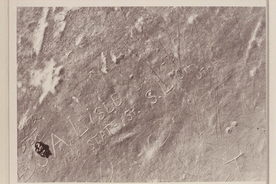 Inscription on huge rock in high cave west of Schock Trail, near Mile 111, north bank
