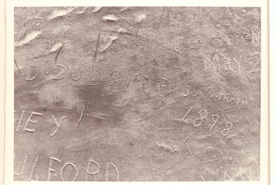 Inscription on huge rock in high cave west of Schock Trail, near Mile 111, north bank