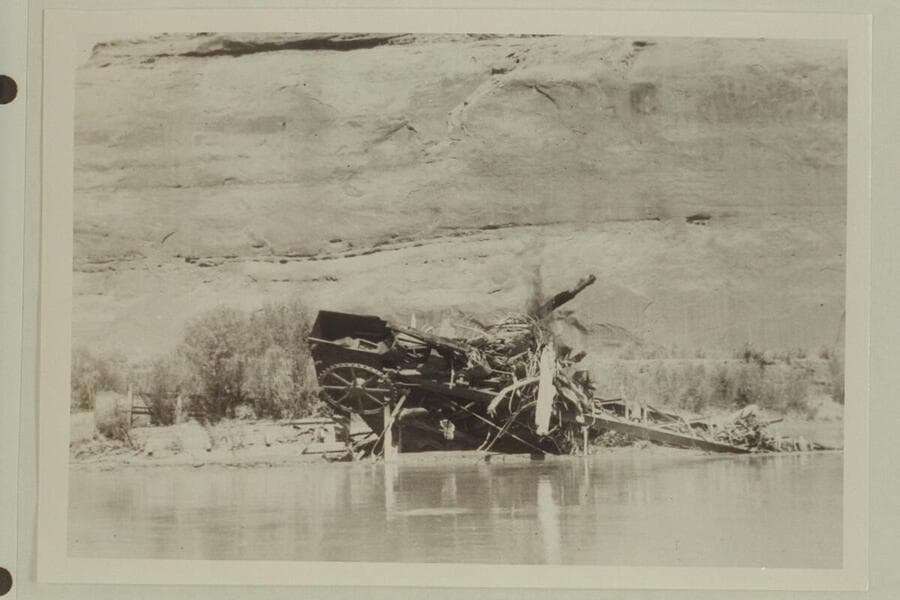 Sarah Fraser on the rim above the wreck of the Stone-Stanton dredge in Glen Canyon above Hansen Creek