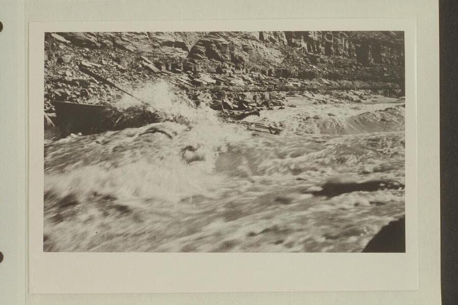 USGS boat on rocks in Dark Canyon Rapid. Lint is on shore and Emery and Ellsworth on the boat. LaRue Colorado River album #173