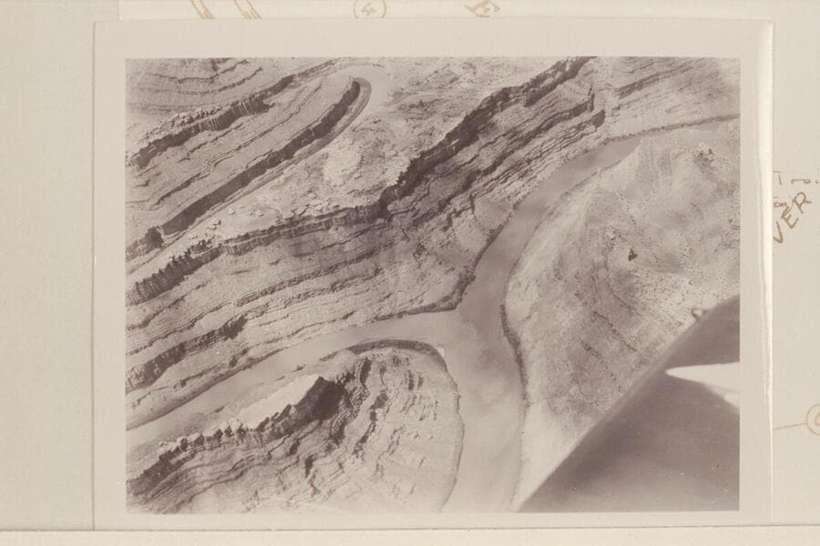 Junction of the Green and Colorado Rivers. The Green enters from the left. The Colorado comes from the top of the print. Approximate gauge: 30,000 cfs.?