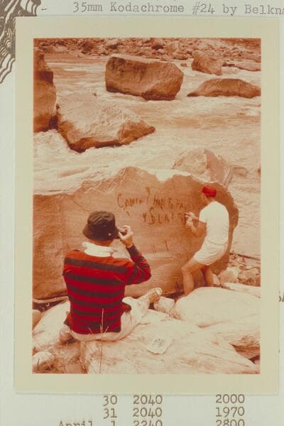 Dock Marston photographs Jorgen Visbak at the Best Expedition inscription at Rapid 16 in Cataract Canyon. Best Wreck Rapid