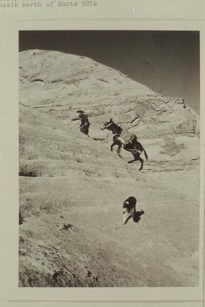 Tobe Owl climbs trail out of Moepitz Canyon between Moepitz Airfield and the basin north of Butte 5014