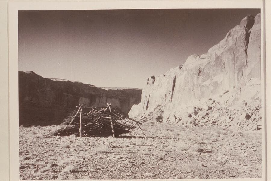 Wreck of pole and brush miners' cabin; Mile 108, left bank, Glen Canyon. Down river from Schock Cabin