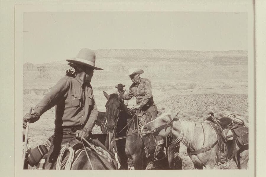 Buck Whitehat; Buster Ordiway; Archeyes Masland. On the black brush mesa north of the northeast fork of 73.6 on ride into the middle fork. Fifty Mile Mountain in background