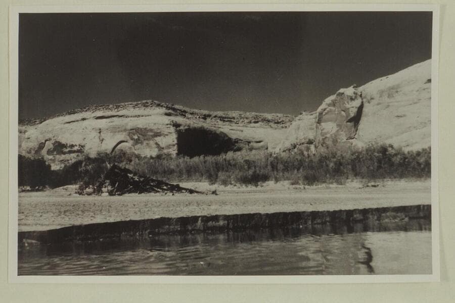 Portion of Stanton Dredge exposed above low water and silt bar. Mouth of "Wilson Creek"