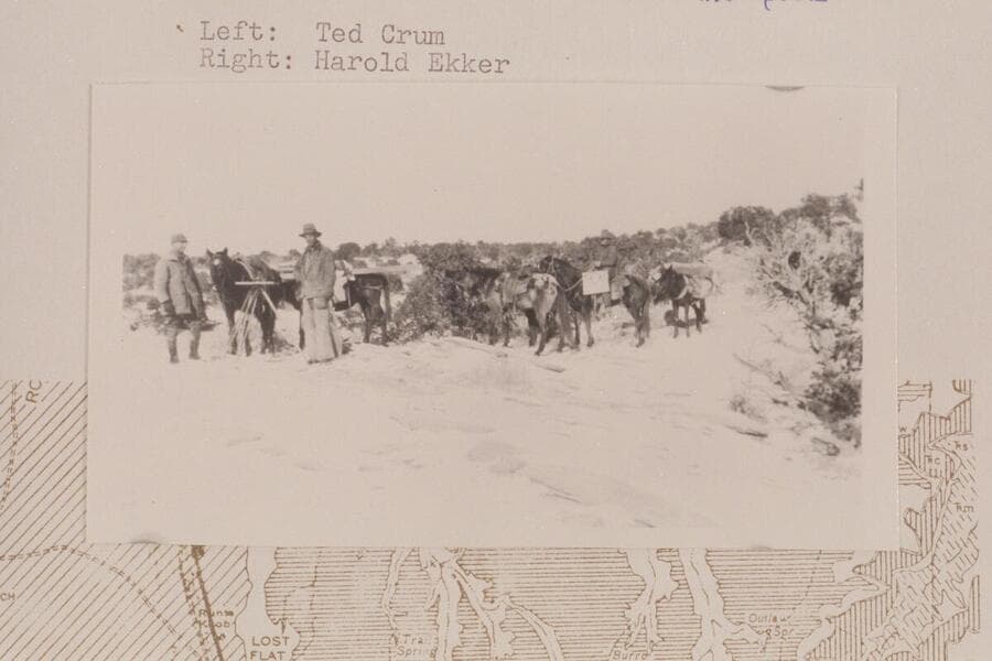 Camp on Black Mesa. Nequoia Arch Survey. Black Mesa Traverse. Winter. Arthur and Harold Ekker in camp