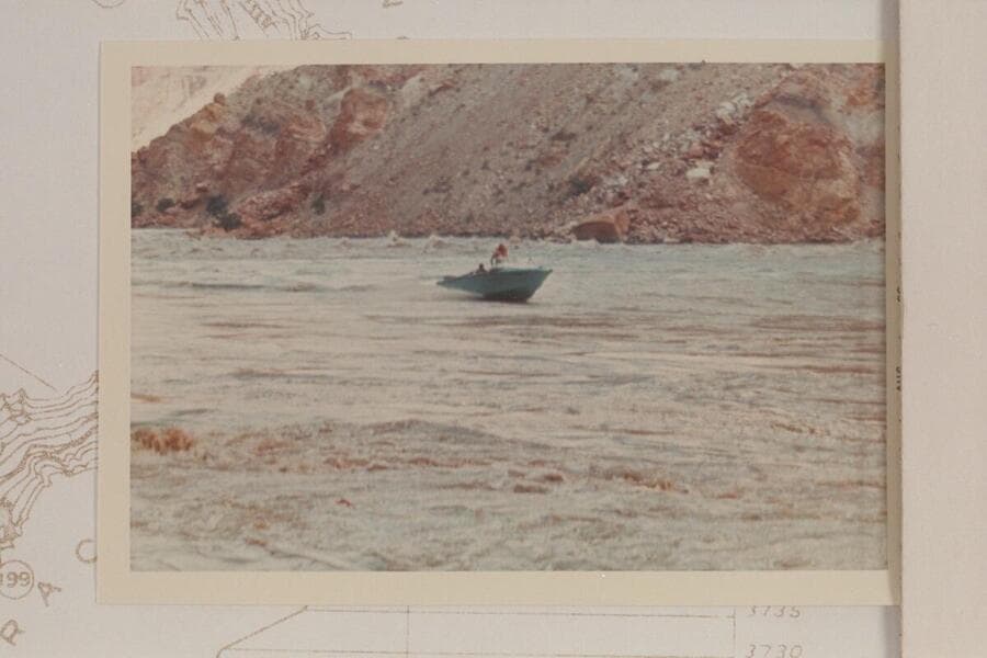 Harris-Brennan boat out of lower end of Rapid 22. The Sliced Boulder is just ahead of the boat