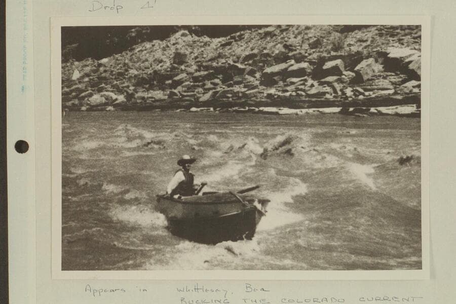 Harry Aleson in Narrow Canyon or lower end of Cataract Canyon. The boat is the outboard powered "Up Lake."