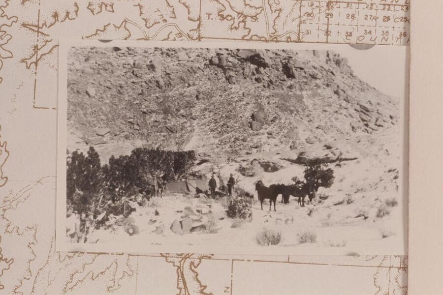 Camp on Black Mesa. Nequoia Arch Survey. Black Mesa Traverse. Winter. Arthur and Harold Ekker in camp