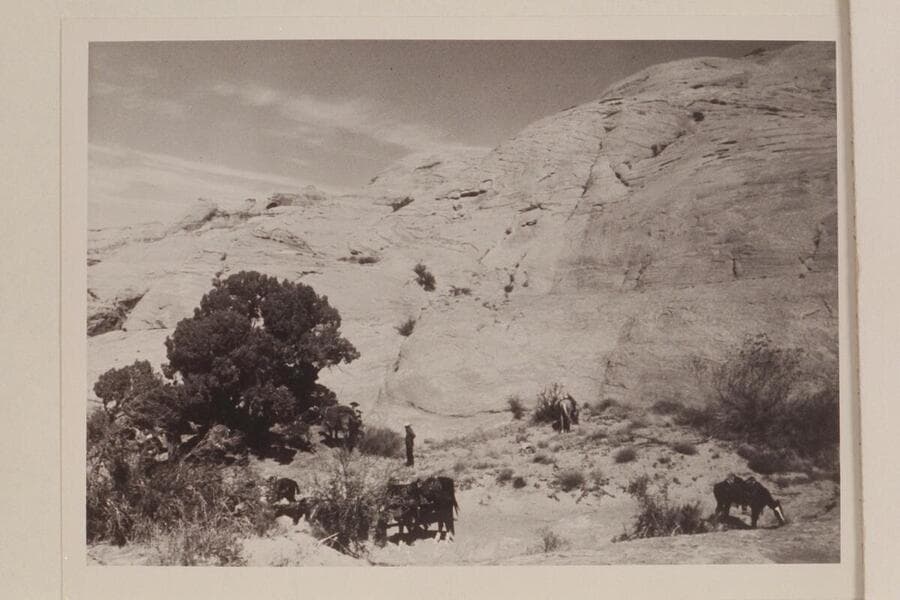 Across the northerly drainage into Lehi Creek to base camp of 1959. From Little Gray Mesa north of Lehi Canyon and east of the joint
