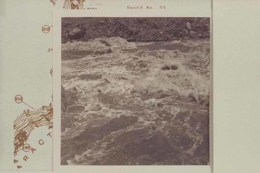 Across from left bank below head of Rapid 22 in The Big Drop. The rock with the rounded top appears in 2711 CTCN 3 and in Bennett #8-90 of 1964, June. In this Sleight photo the river stage is higher than in the 1927 and 1964 photos