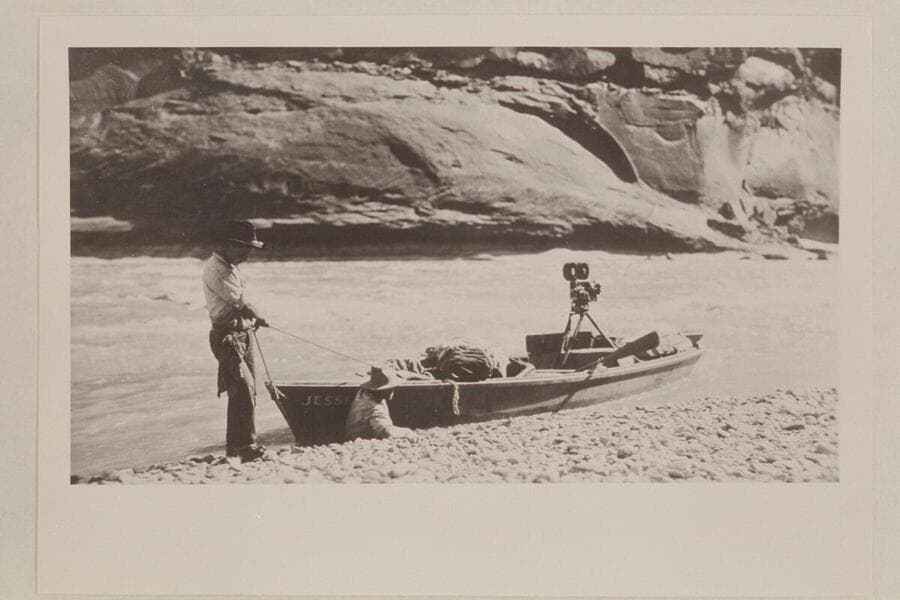 Skiff of Lasky party in small rapid just below Hite; Jesse Lasky, Jr. and Kenneth Wortley