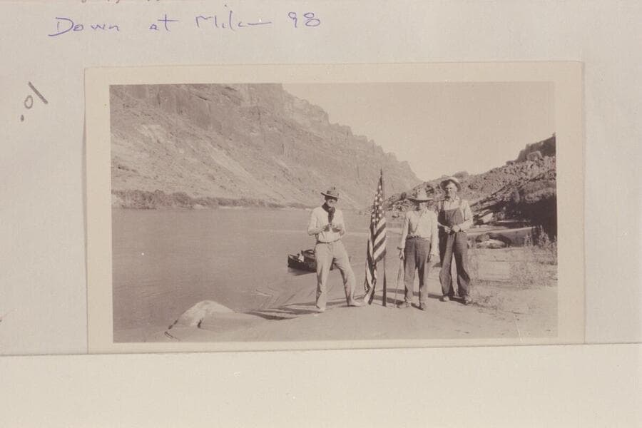George C. Fraser, Dave Rust, Sarah Fraser in Dave Rust's canvas folding boats at camp near Hole-in-the-Rock. Mile 84; Glen Canyon