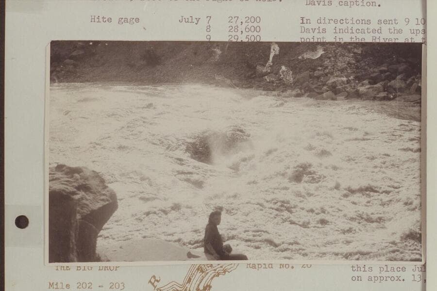 Fern Davis at the head of Rapid 22, Mile 202.4. Early AM. Davis caption: "On right bank--early morning--Rapid #22--Eddy's book--Fern Davis--Boat was flipped over backwards on the run thru about 25 feet to the right of hole."