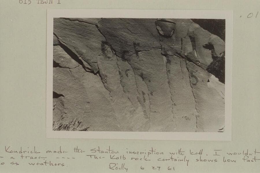 The Kolb inscription on boulder at The Junction. "If Kendrick made the Stanton inscription with Kolb,I wouldn't expect to see a trace--The Kolb rock certainly shows how fast that Rico ss[sandstone] weathers." Reilly, 1961, June 27