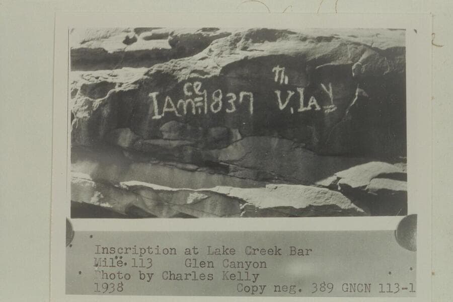 Inscription cut in rock at right bank in Glen Canyon opposite Lake Creek at Mile 113. It is generally thought to be a fake