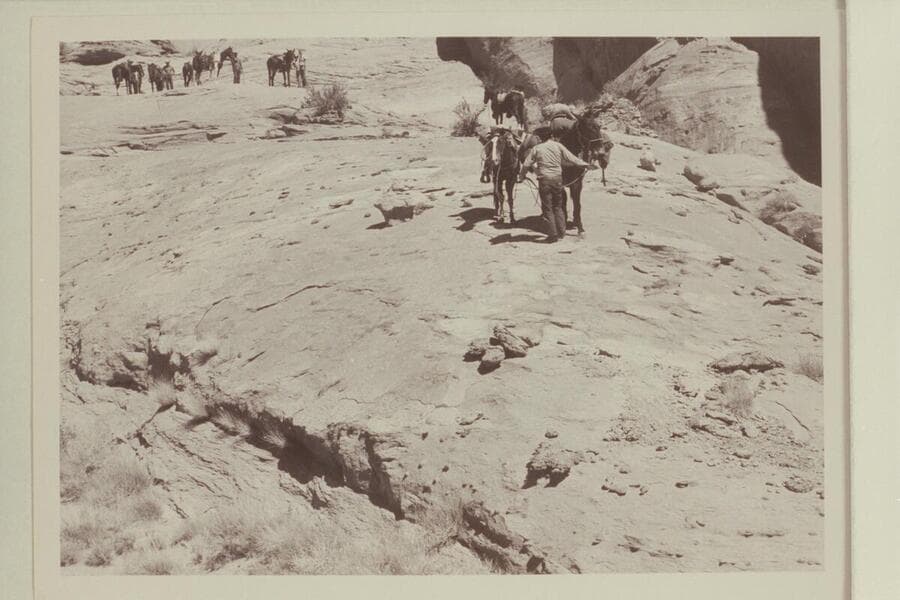 Leading the stock down the slick rock into head of the northeast fork of 73.6