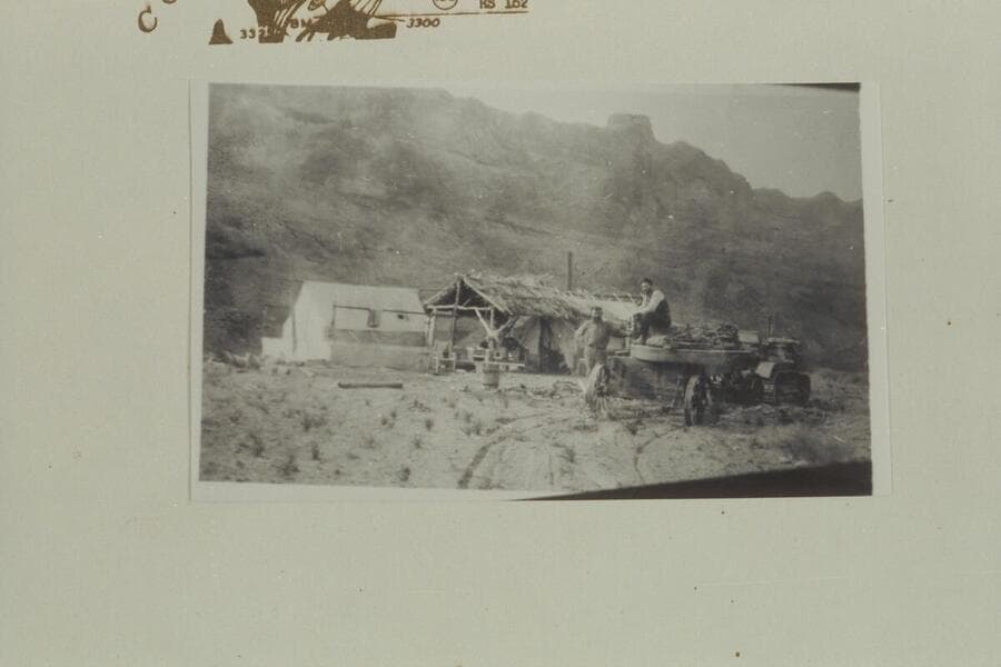 Camp for Placer operations on Gretchen Bar. Johnson is center, Andy is watching