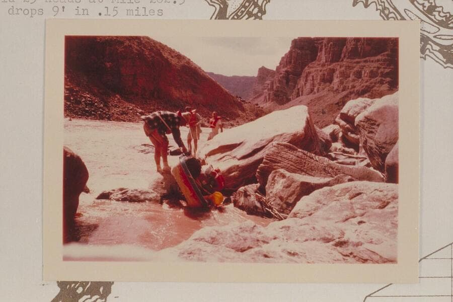 Up River in Rapid No. 23. Buzz Belknap and Dock Marston work with the Sportyaks. The Sliced Boulder is center