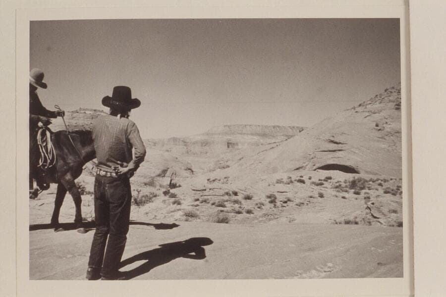 Buck Whitehat and Tobe Owl at upper end of the black brush mesa north of the northeast fork of 73l.6. Fifty Mile Mountain in distance