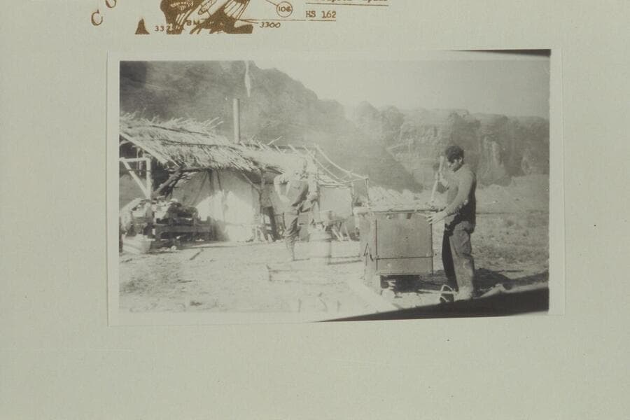 Camp for Placer operations on Gretchen Bar. Johnson is center, Andy is watching
