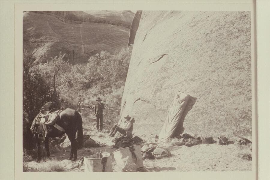 At camp in middle fork of 73.6. Dan Lehi; Chris Turner; Bill Belknap; Buster Ordiway; Tom Daly; Buck Whitehat; Tobe Owl or Nasja Begay