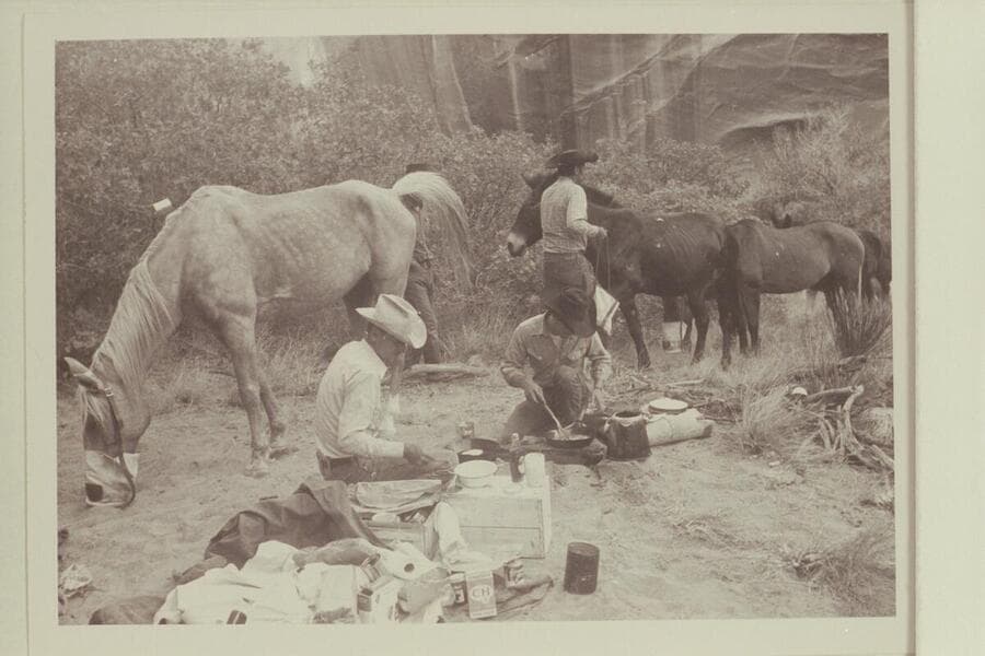 Camp in the middle fork of 73.6. Dan Lehi; Bill Belknap; Tom Daly; Buster Ordiway; Dock Marston; Archeyes Masland; Noel Morss; Tobe Owl (Nasja Begay)