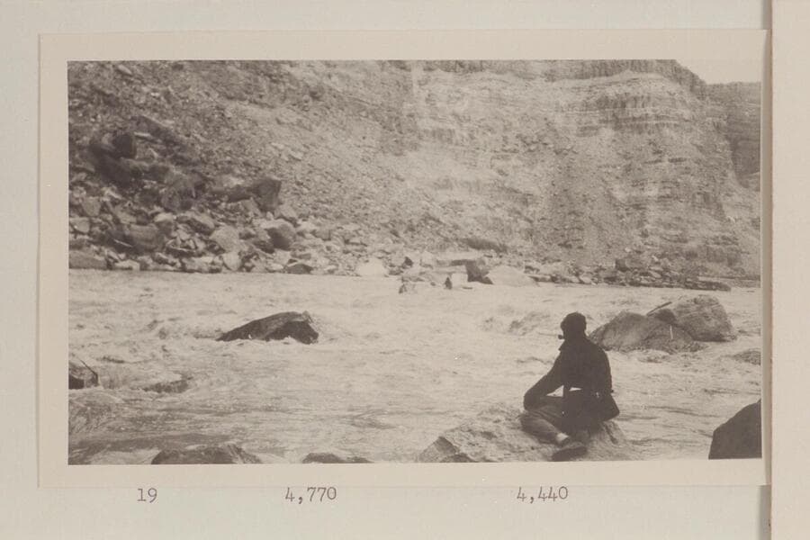 Virginia Lowrey sits in Owen Clark's lap. Val Woodbury coils a line. Lees Ferry. Pathe-Bray Expedition. Copy of print in David C. Lowrey collection