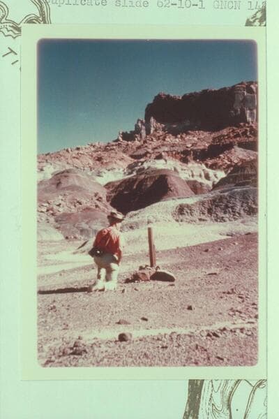 Dock Marston examines a claim stake in cayons at mile 147-148, left bank