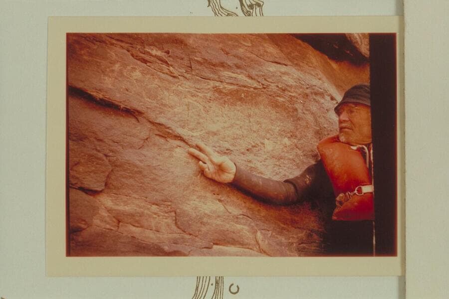 Dock Marston posed at the 1836 D. Julien inscription at Mile 185.75 Cataract Canyon