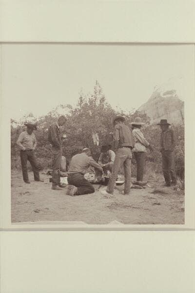 Camp in middle fork of 73.6. Archeyes Masland; Dock Marston; Bill Belknap; Buster Ordiway; Dan Lehi; Tobe Owl; Buck Whitehat