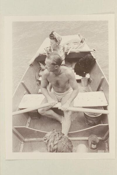 Pres and Becky Walker on the Dolores River. They are riding in the "Rainbow Trail," one of the punts used by Nevills on the dude wrangling on the San Juan River