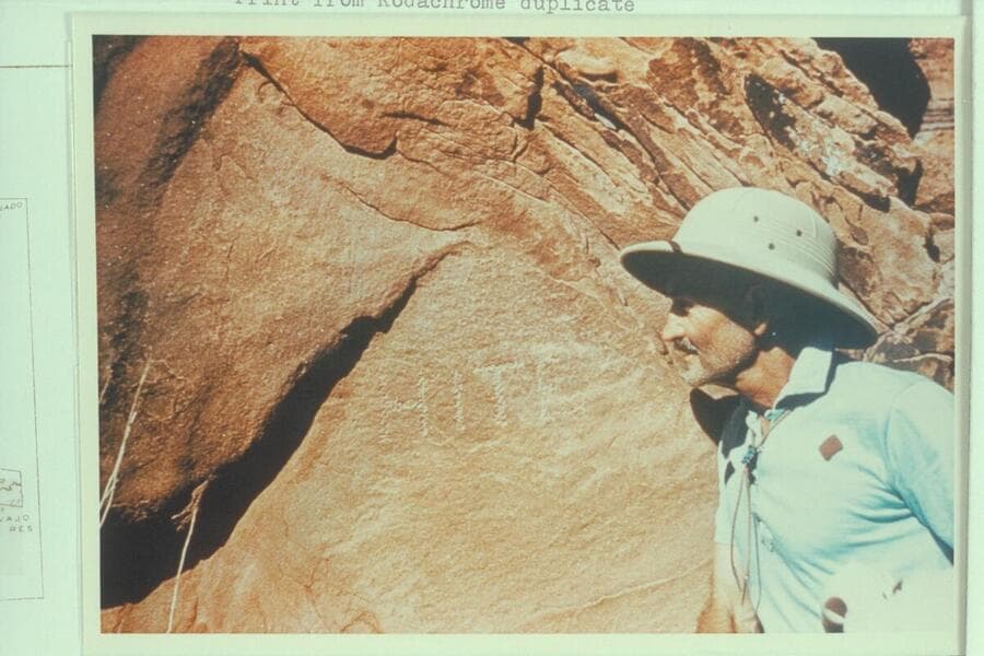 Harry Aleson looking at the Hite inscription at a small indent at Mile 143.9 RB in Glen Canyon