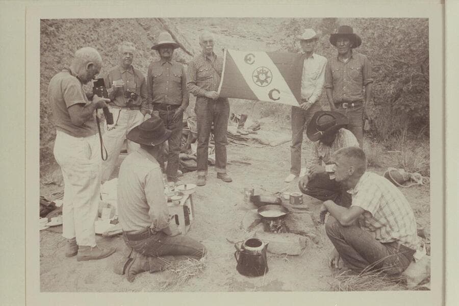At camp in middle fork of 73.6. Dan Lehi; Chris Turner; Bill Belknap; Buster Ordiway; Tom Daly; Buck Whitehat; Tobe Owl or Nasja Begay