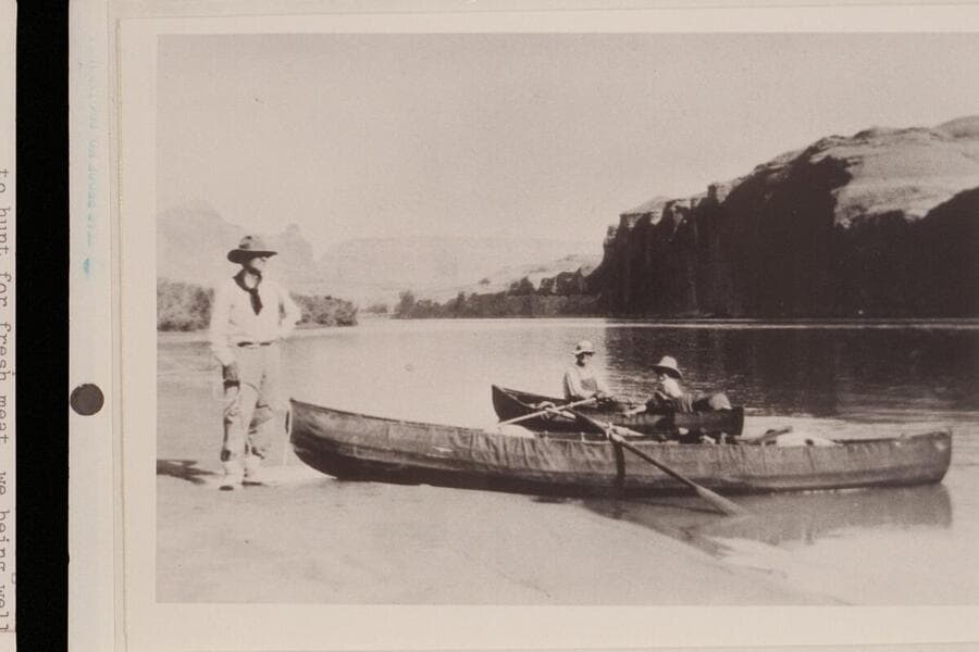 George C. Fraser, Dave Rust, Sarah Fraser in Dave Rust's canvas folding boats at camp near Hole-in-the-Rock. Mile 84; Glen Canyon