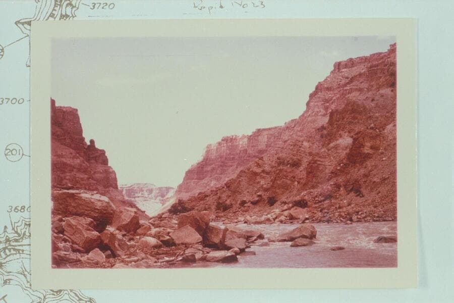 Up to Rapid No. 21 from fan at mouth of ----- Canyon ["Calf" is crossed out] Rapid No. 21 heads at Mile 202.8 and drops 10 ft. in .25 miles