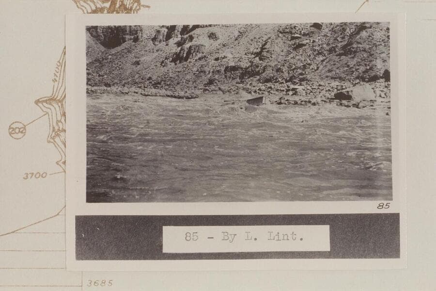 Ellsworth Kolb in USGS skiff in the Brown Betty Rapid, No. 1. The Brown Betty Rapid heads at Mile 212.3 and drops 4 ft. in .15 miles