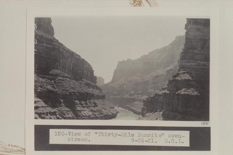Down to Thirty-Mile Damsite from the upstream side of CoVe CAnyon. The beach where Chenoweth Viewed the D. Julien inscription is in the shadow of the oVerhang at the left bank at lower margin