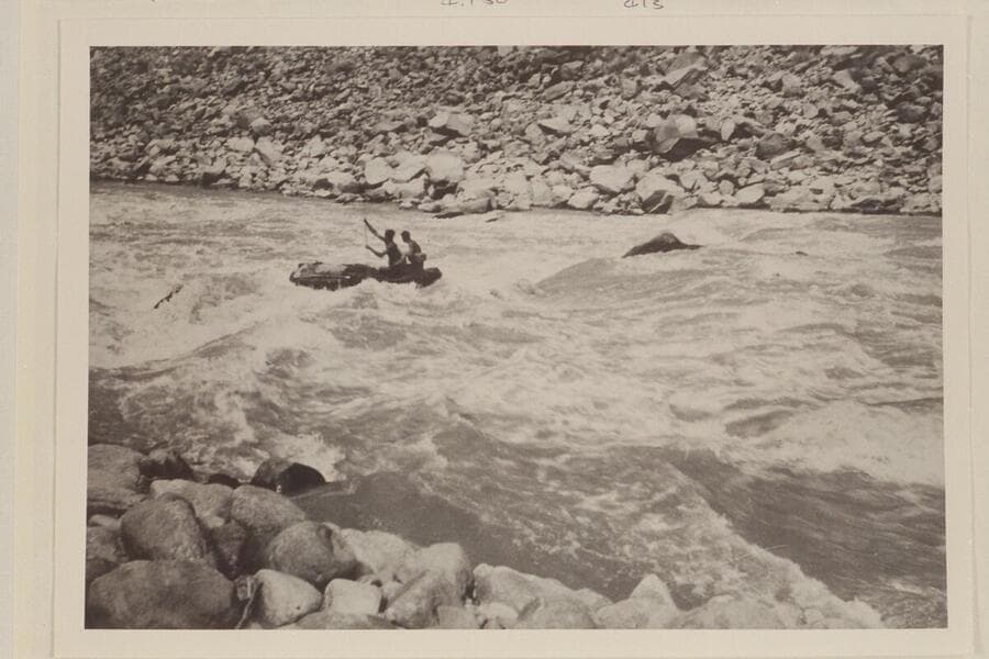 Southwest Exploration party in Cataract Canyon. In the boat are Ken Ross and Jon Lindbergh. "In No. 23"