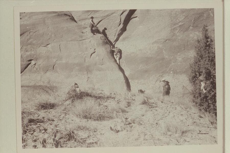 On the trail between the middle fork and the southwest fork--73.6. Eisaman photographed Archeyes Masland going up the rope