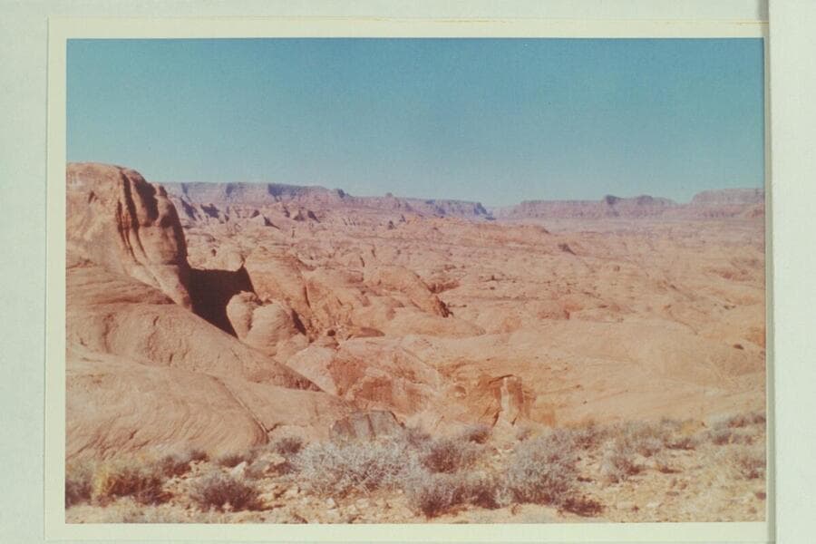 Across the forks of 73 and down Glen Canyon from the top of Black Brush Mesa. The butte at left is between the northeast fork and the middle fork