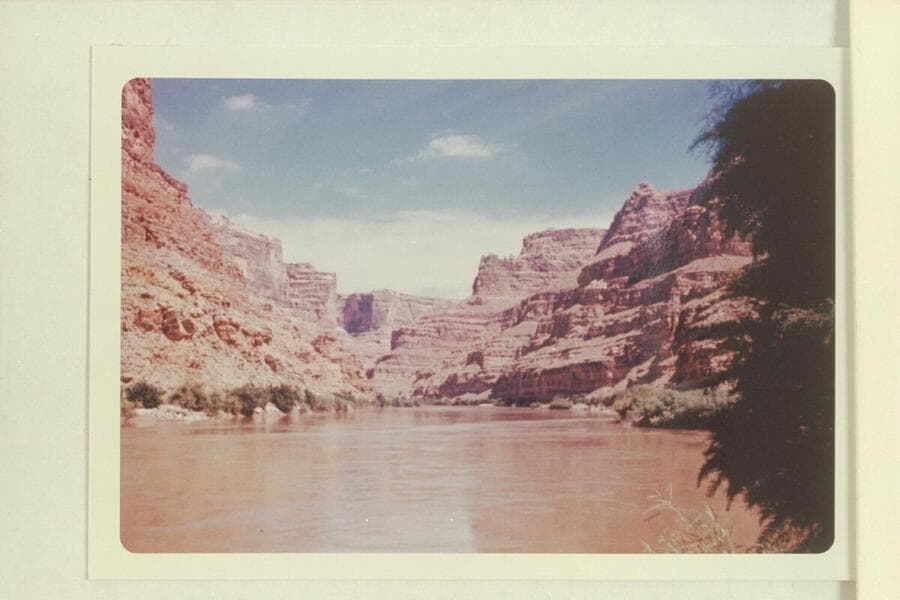 Up river from the upper end of the beach at Rapid No. 43, Mile 184.5. The side canyon just left of center is Cove Canyon at Mile 186.2