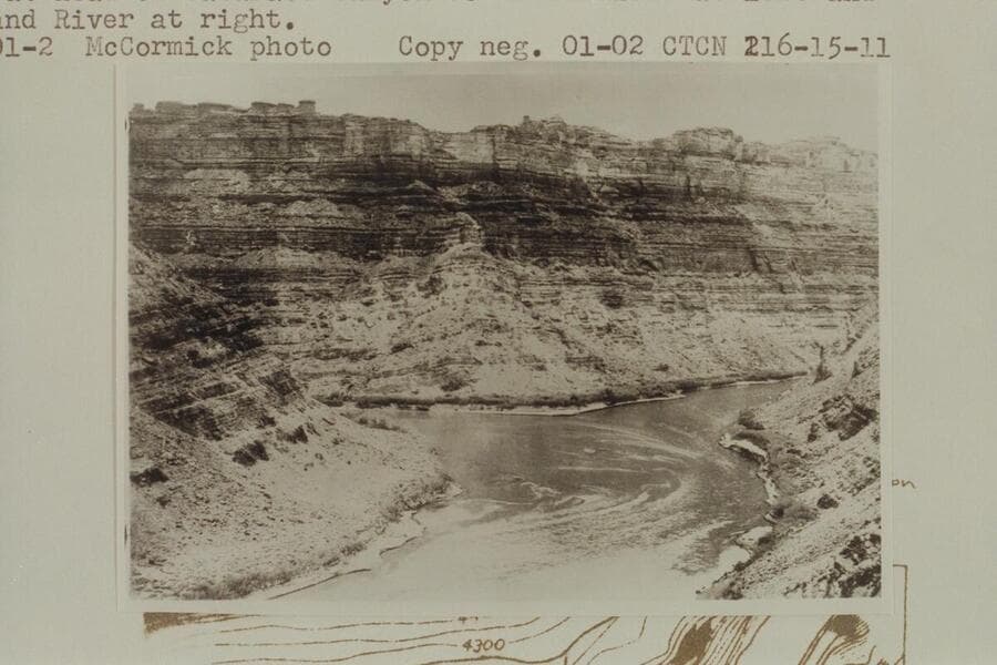 Up Cataract Canyon from Mile 216.5, left bank to the mouth of the Green River. The Green River enters from the left and the Grand River from the right