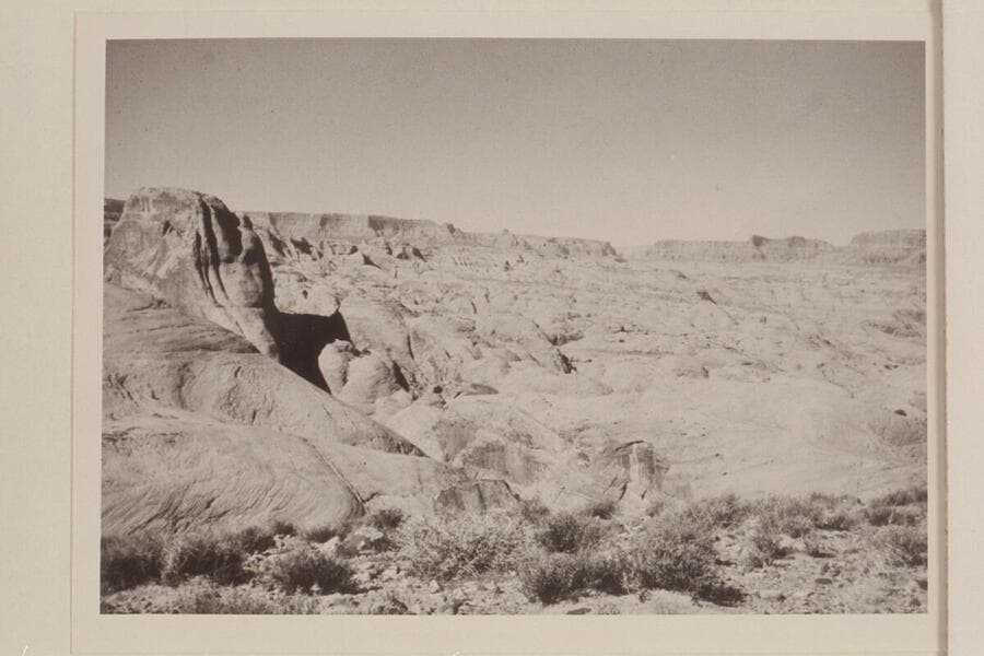 Across 73 and down Glen Canyon from top of Black Brush Mesa; Butte is between northeast fork and middle fork