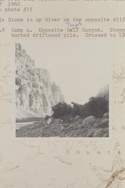 Upstream from camp opposite Teapot Canyon at Mile 202.8. 303 Mile Stone is up river on the opposite cliff. 202.8, Camp 4. Opposite Teapot Canyon. Stopped right bank, burned driftwood pile. Crossed to left bank to camp