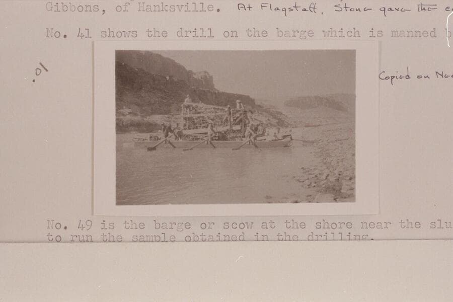 Shows the Keystone Drilling Machine on the barge which is manned by sweeps